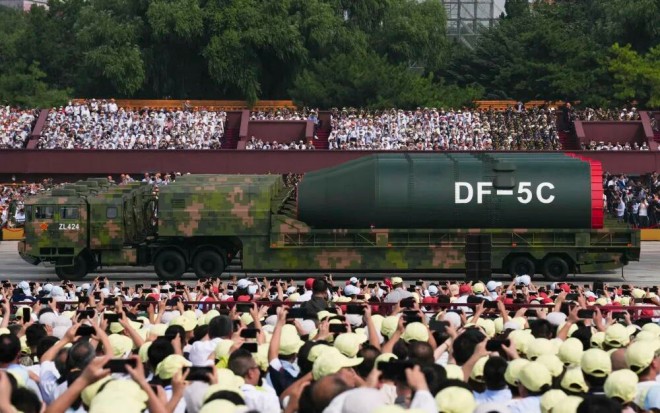 鐵流浩蕩,威震寰宇。“東風(fēng)-5C”液體洲際戰(zhàn)略核導(dǎo)彈是鑄就和平盾牌的戰(zhàn)略利器,在裝備方隊(duì)壓軸出場(chǎng)時(shí),全場(chǎng)響起歡呼聲。