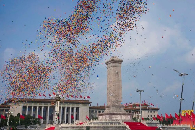 8萬(wàn)羽和平鴿振翅飛翔,8萬(wàn)只氣球騰空而起,飛過(guò)天安門(mén)城樓,飛越人民英雄紀(jì)念碑,飛向更高更遠(yuǎn)的藍(lán)天。