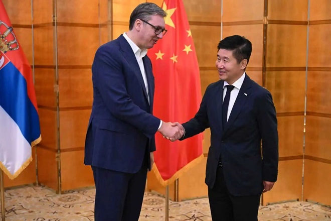 中國駐塞爾維亞大使李明,塞爾維亞前總統(tǒng)、中塞俄政府合作委員會主席托米斯拉夫·尼科利奇參加會見。