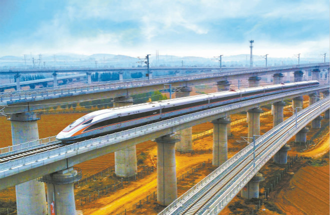 11月5日,魯南高鐵日照至曲阜段開始試運行(如圖)。魯南高鐵是國家“八縱八橫”鐵路網的重要組成部分,東起山東省日照市,向西經臨沂市、濟寧市、菏澤市,與河南省鄭徐高鐵蘭考南站接軌,全長約為494公里。該項目自2017年1月25日開工建設以來,累計使用山鋼產品4萬余噸,用于沿線高鐵站以及路橋建設。 (特約通訊員 李建輝 攝)