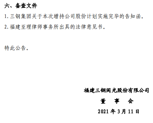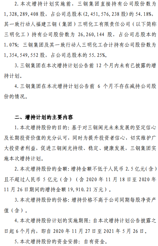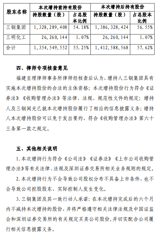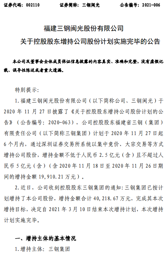 三鋼閩光:關于控股股東增持公司股份計劃實施完畢的公告
