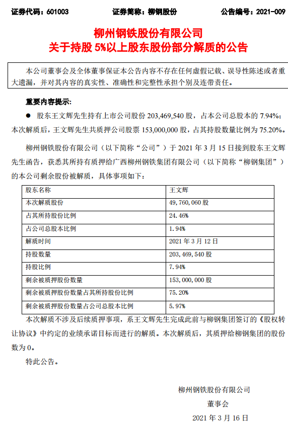 柳鋼股份關于持股5%以上股東股份部分解質的公告