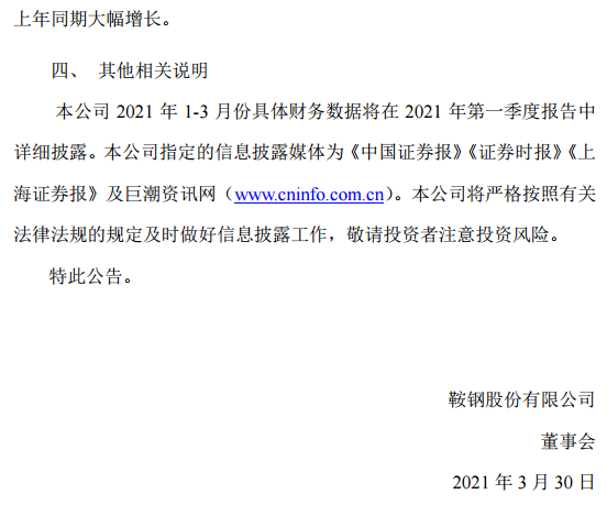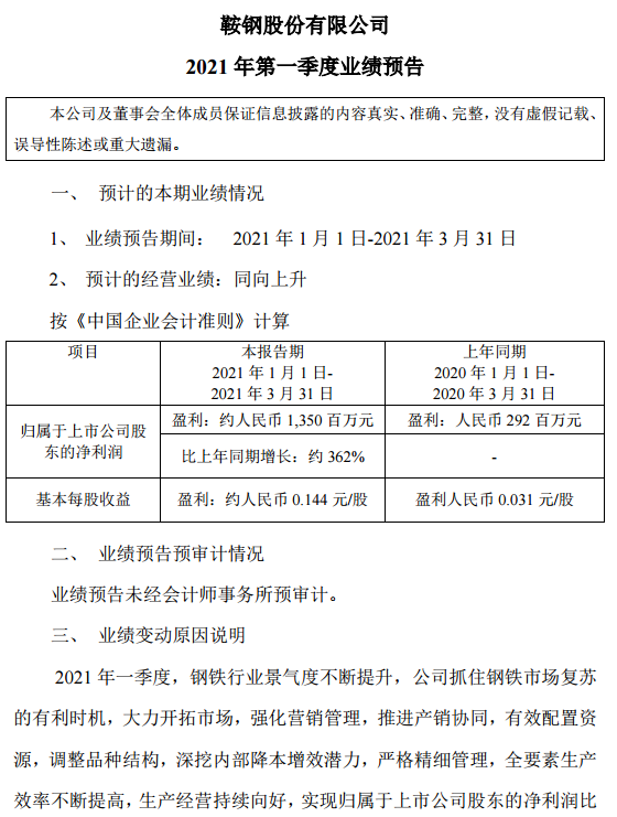 鞍鋼股份:鞍鋼股份2021年第一季度業績預告