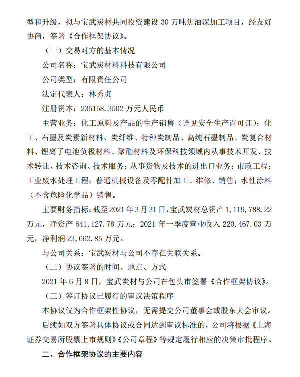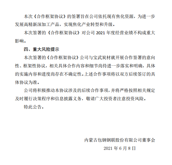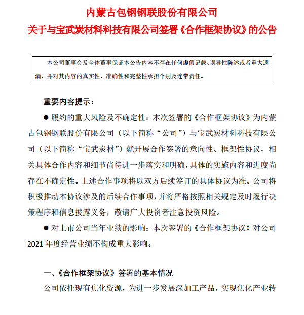 包鋼股份關(guān)于與寶武炭材料科技有限公司簽署《合作框架協(xié)議》的公告