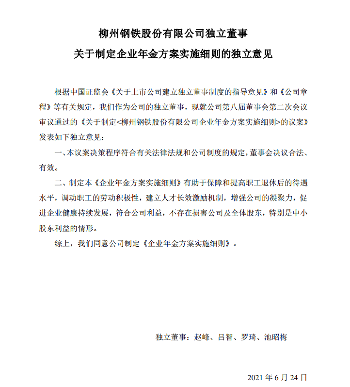 柳鋼股份獨立董事關于制定企業年金方案實施細則的獨立意見