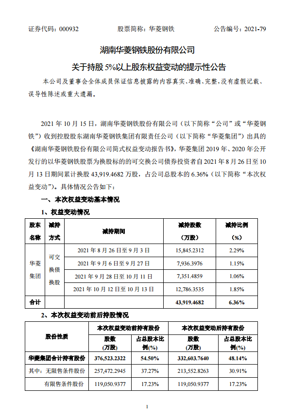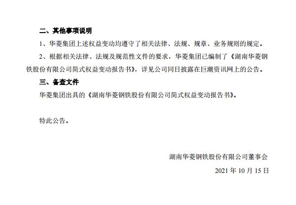 華菱鋼鐵:關于持股5%以上股東權益變動的提示性公告