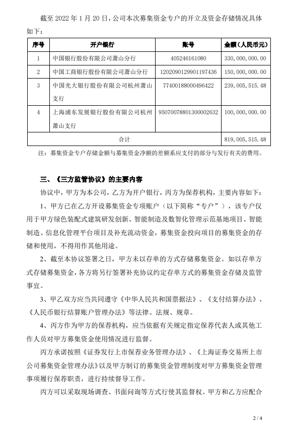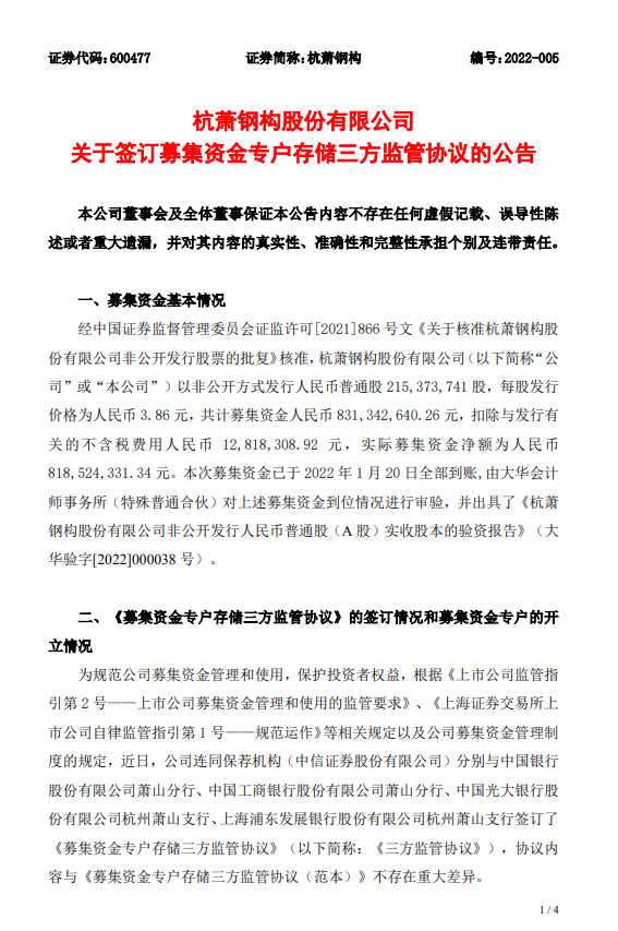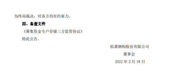 杭蕭鋼構(gòu)關(guān)于簽訂募集資金專(zhuān)戶存儲(chǔ)三方監(jiān)管協(xié)議的公告