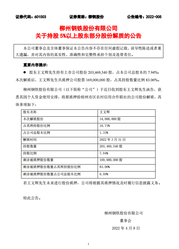 柳鋼股份關于持股5%以上股東部分股份解質的公告