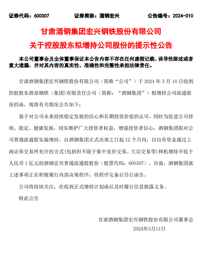 酒鋼宏興:酒鋼宏興關(guān)于控股股東擬增持公司股份的提示性公告