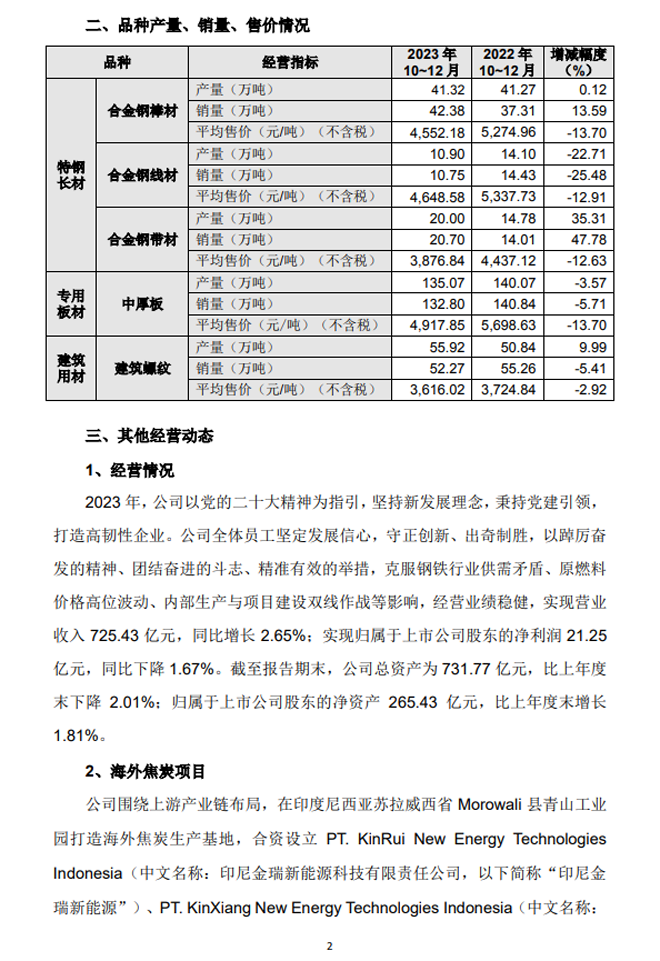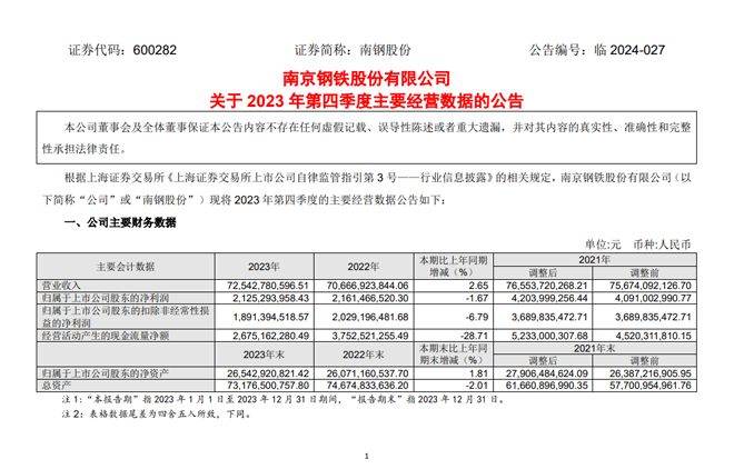 南鋼股份:南京鋼鐵股份有限公司關于2023年第四季度主要經營數據的公告