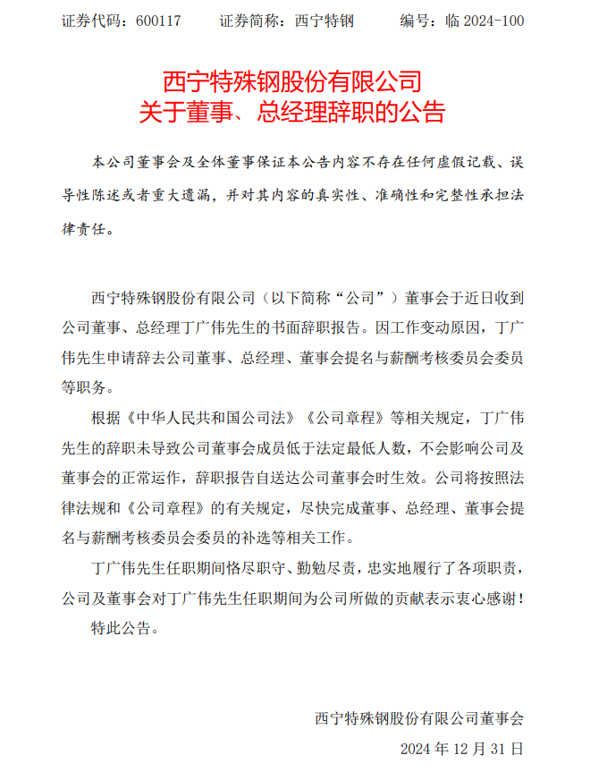 西寧特鋼:西寧特殊鋼股份有限公司關于董事、總經理辭職的公告