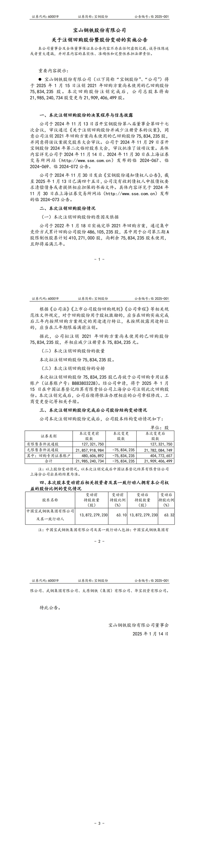寶鋼股份:寶鋼股份關(guān)于注銷回購股份暨股份變動(dòng)的實(shí)施公告