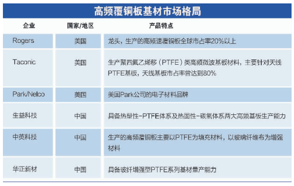 在高頻覆銅板基材市場,聚四氟乙烯(PTFE)樹脂型覆銅板是目前高頻微波基板材料最主要的品種,在5G時代有望迎來較大增長空間。