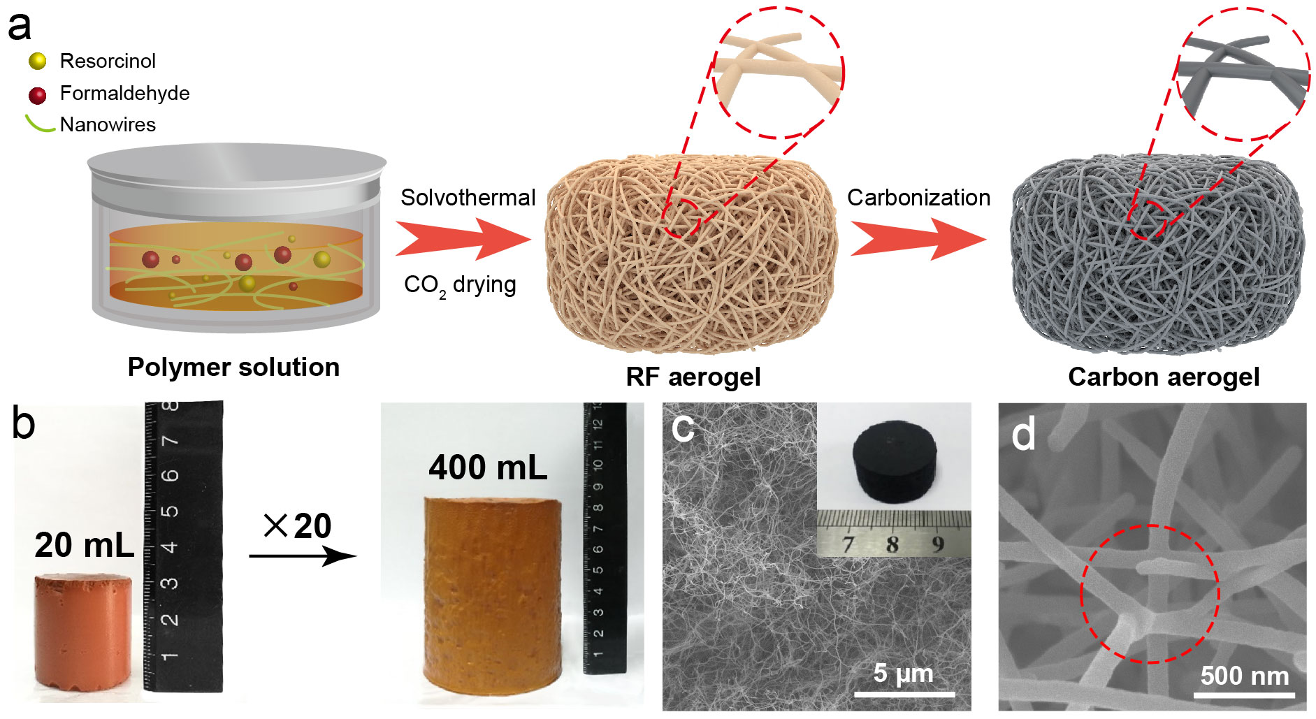 圖1. 硬碳氣凝膠的制備。(a)示意圖,表明通過使用納米線作為模板的通用合成方法;(b)以BCNF@RF為例,宏量合成RF納米纖維水凝膠;(c)硬碳氣凝膠SEM圖像;(d)顯示納米纖維網狀結構和纖維-纖維的焊接點。