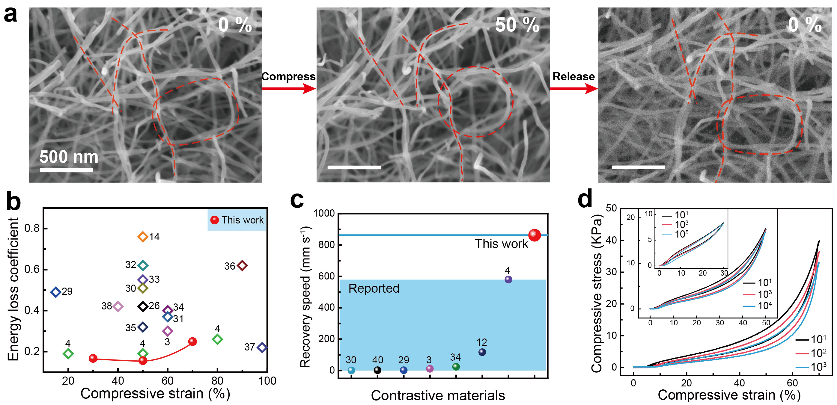 圖2.碳氣凝膠的機械性能。(a)BCNF@C氣凝膠的原位SEM;(b)不同材料能量損耗系數的對比;(c)不同材料回彈速度的對比;(d)碳氣凝膠不同循環下的應力-應變曲線