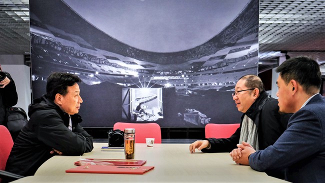 圖為陸聞言(右二)與于文國(左)交流攝影展的有關(guān)情況。
