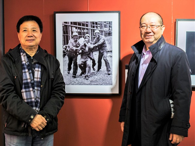 圖為于文國(左一)正向陸聞言一行介紹攝影展上的作品。