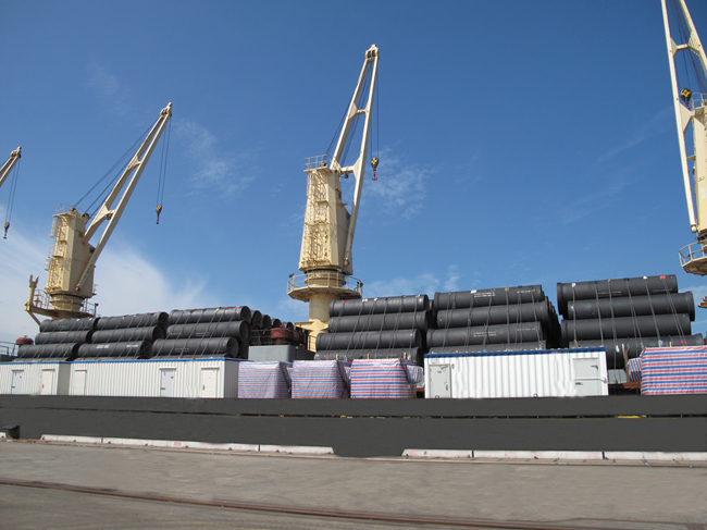 本鋼北營鑄管公司堅持品種創新、創效,“以特制勝、以特創效、以特促銷”的戰略,截至10月份,該公司新開發的“T”型接口DN2400、DN2600管,內自錨DN900、DN1800管處于鑄管行業領先水平,新特品種銷量比去年同期提高了10%,取得了較好的經濟效益。圖為在港口已經裝船待發的“本鋼牌”鑄管。(記者 錢振德 實習記者 那麗 攝)