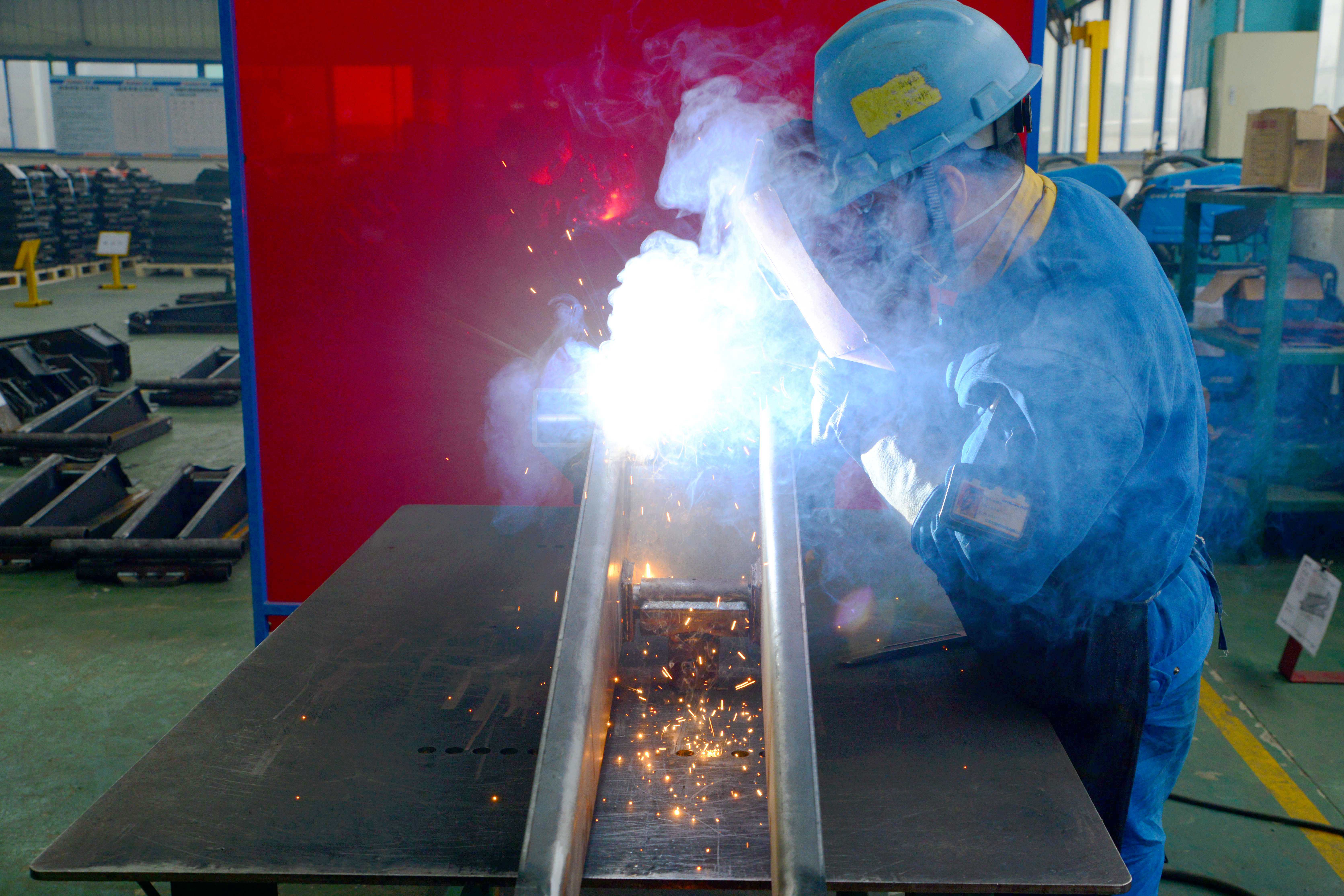一位工人正在焊接出口美國(guó)的拖車(chē)部件。