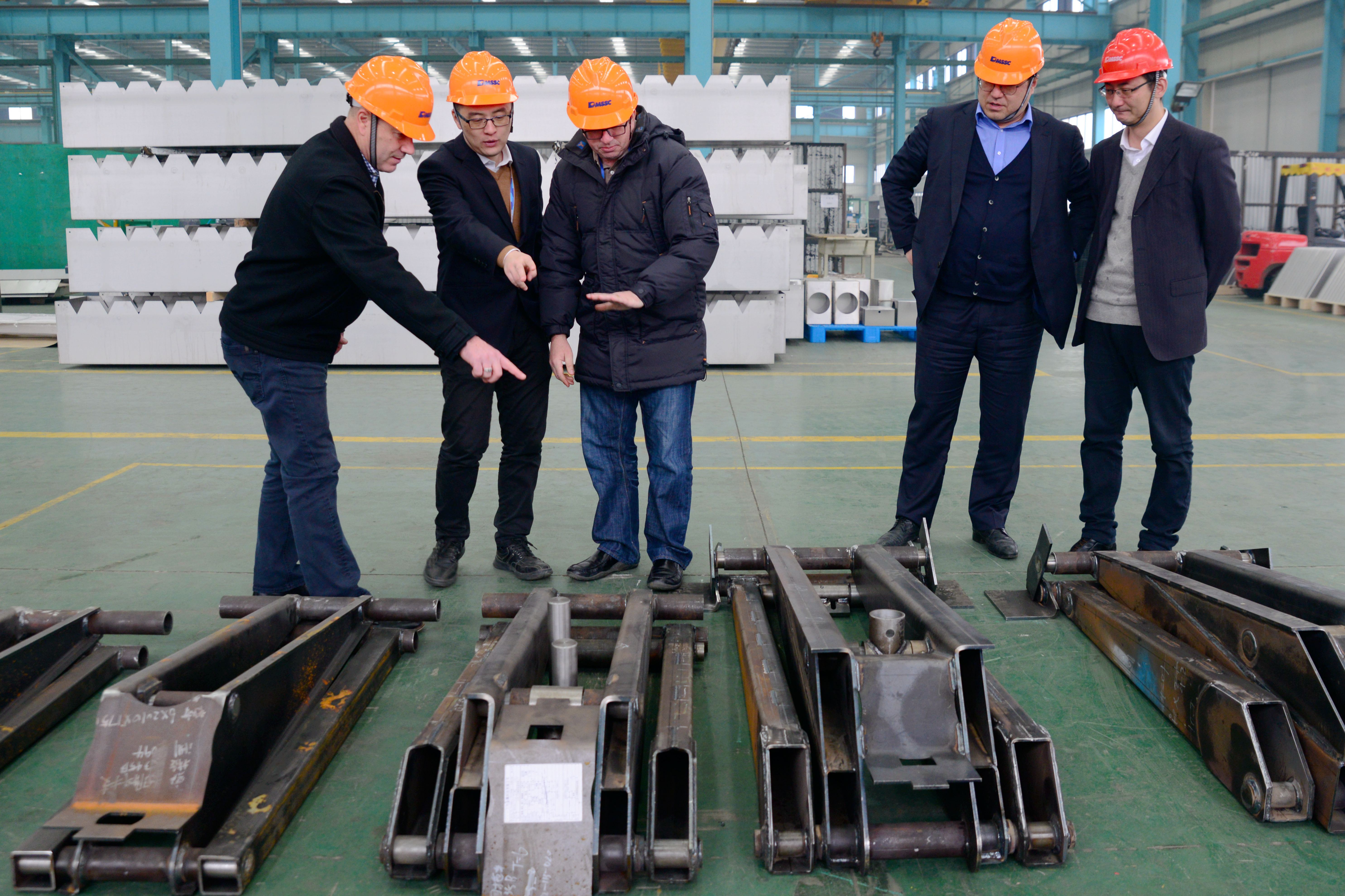 兩位美國(guó)商務(wù)代表考察拖車(chē)部件加工進(jìn)度。