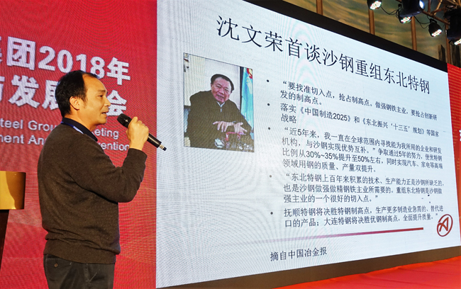 2018年1月24日,混改重組后的東北特鋼集團在大連萬達酒店隆重召開以“新時代新東特新發展”為主題的2018年營銷合作與發展年會。來自國內外290余家重點客戶單位的360余名代表相聚濱城,共商發展。圖為會議上應邀嘉賓作演講。(特約通訊員 劉德斌 攝)