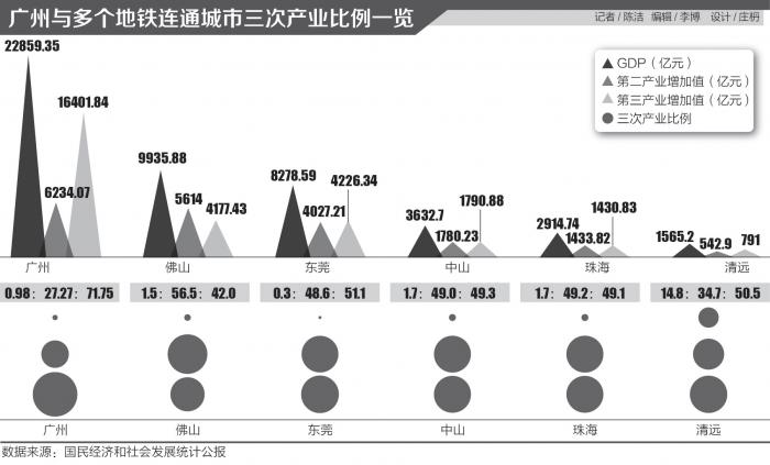 從多個城市的服務(wù)業(yè)在GDP中的占比,可以看出廣州服務(wù)業(yè)的優(yōu)勢地位。目前,廣州第三產(chǎn)業(yè)增加值在GDP中的占比達(dá)到71.75%,遠(yuǎn)遠(yuǎn)高出佛山的42%、東莞的51.1%、中山的49.3%、珠海的49.1%和清遠(yuǎn)的50.5%。而這些城市,都已經(jīng)或者將與廣州地鐵連通。