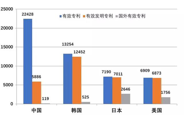 圖2.中韓日美有效專利、有效發明專利、國外有效專利情況