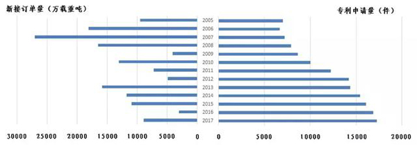 圖1.全球專利申請量與船舶新接訂單量對比情況