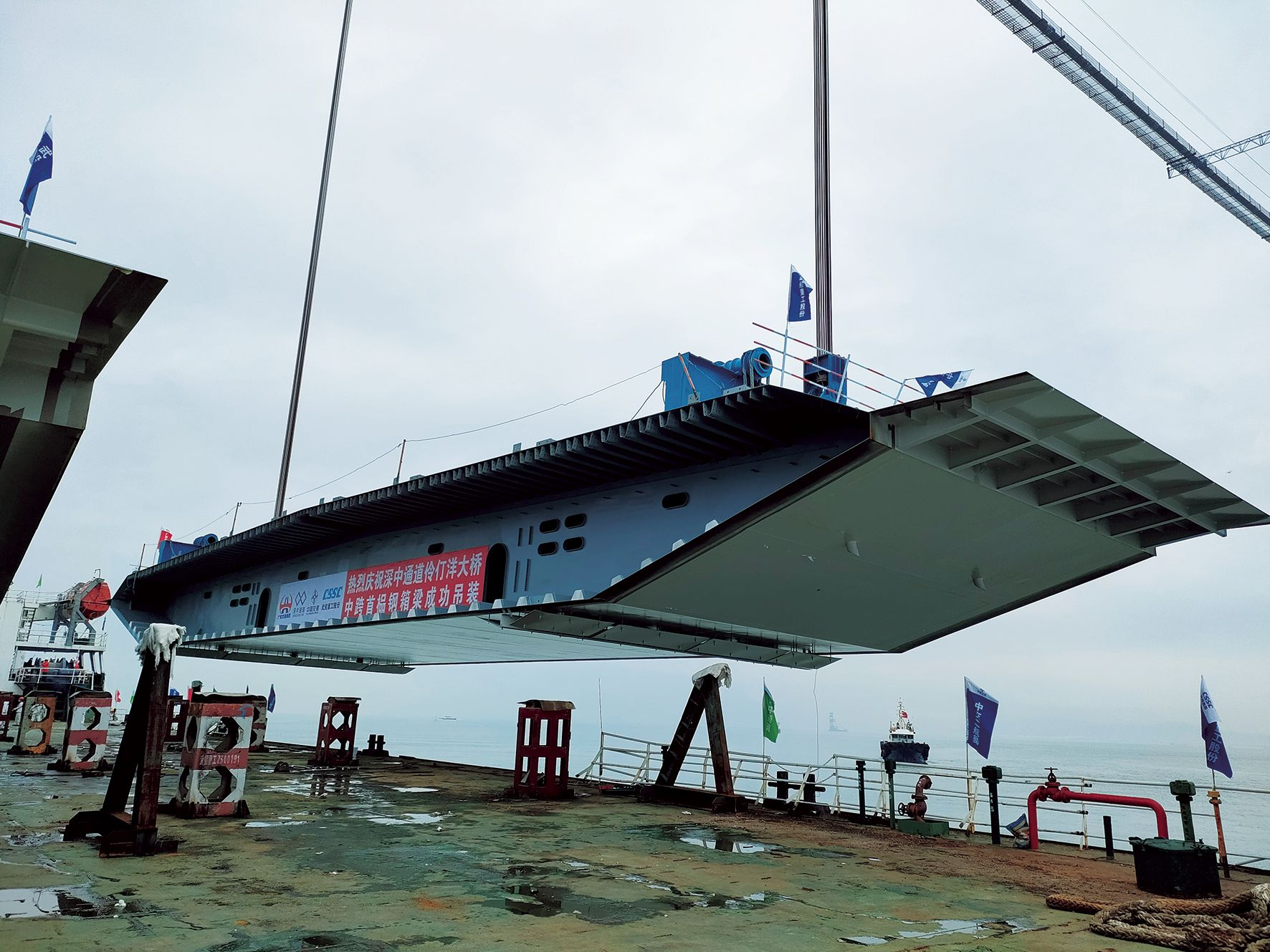 圖為深中通道鋼箱梁吊裝現場。(湘鋼供圖)