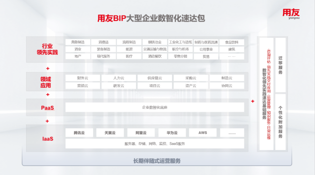 用友BIP大型企業數智化速達包Fast By BIP與國內和國際主流云計算提供商(IaaS)合作,以專屬云的方式部署客戶數據和應用系統,客戶既享有專屬環境又能夠獲得云計算帶來的新價值。全面適配了IaaS、PaaS、SaaS及專業服務,通過專業技術工具,幫助企業快捷、經濟、安全遷移上云。讓企業減少了復雜的IT基礎設施與資源部署,一鍵直達應用,并享受云端帶來的持續創新和迭代,快速上線、快速見效。