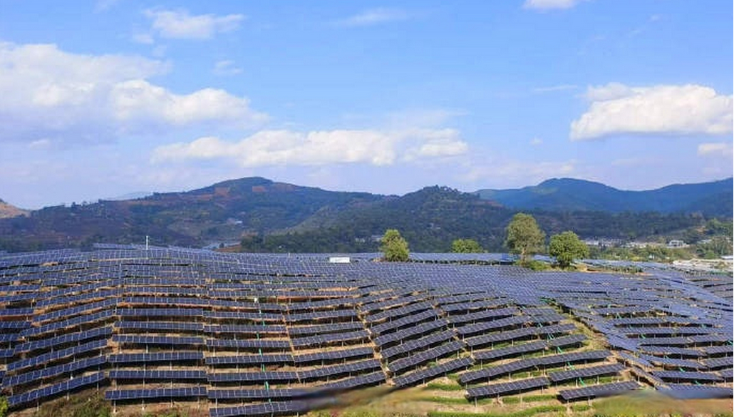 南屏西光伏項目坐落于思茅區整碗村,作為普洱市首批并網的“茶光互補”項目,它不僅利用充足的光照資源將太陽能轉化為清潔電能,每年可生產綠電超過1億千瓦時,還創新采用大間距、高支架、組件單排布置光伏板,探索“板上發電,板下種茶”的“農光互補”模式,提高土地利用率的同時拓寬了農民的增收渠道,實現生態效益和經濟效益雙贏。