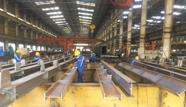 圖為在中國五冶鋼結構生產基地內,工人正在緊張作業。