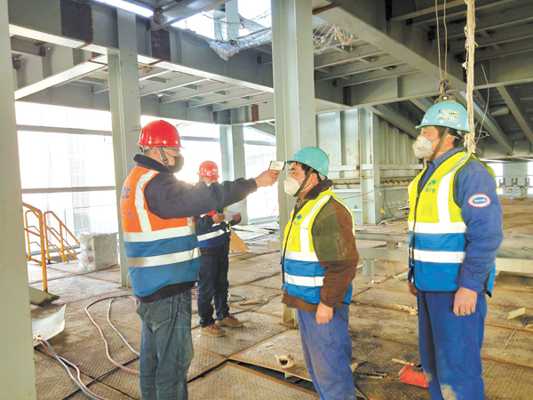 圖為上海二十冶五干河鋼渣處理線搬遷項目部正在給復工人員測量體溫。