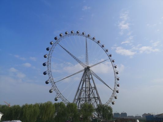 該設備位于山東省菏澤市文亭湖,整體高度為88米,轉盤直徑約為83米,配有36個直徑為2600mm的新式豪華球形吊艙和144根直徑為20mm的高強度拉索,配備豪華覆蓋式巨型燈飾方案,結構新穎,安全可靠,美麗壯觀。通過使用新式球形吊艙,燈光采用進口芯片豪華覆蓋式巨型燈飾以及無線遠程控制技術等創新方式,該設備已成為菏澤市成武縣地標性建筑,是成武縣重點游樂工程。