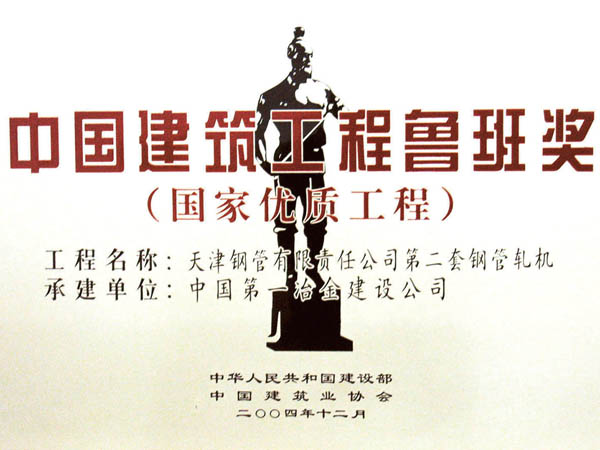 由中國一冶天津公司承建的天津鋼管公司第二套軋管工程榮獲“魯班獎”。