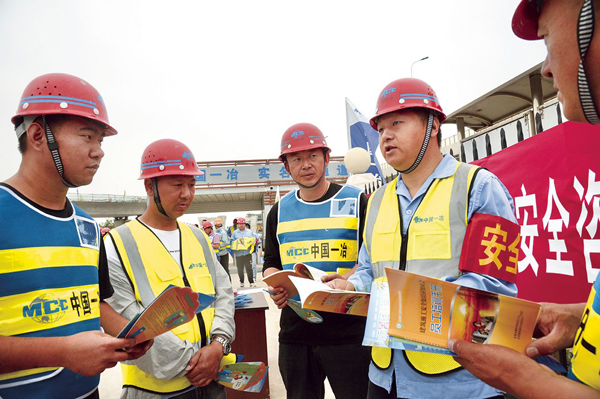 圖為在中國一冶天津公司“黨員都是安全員”活動中,黨員突擊隊成員為項目施工人員發放安全手冊。