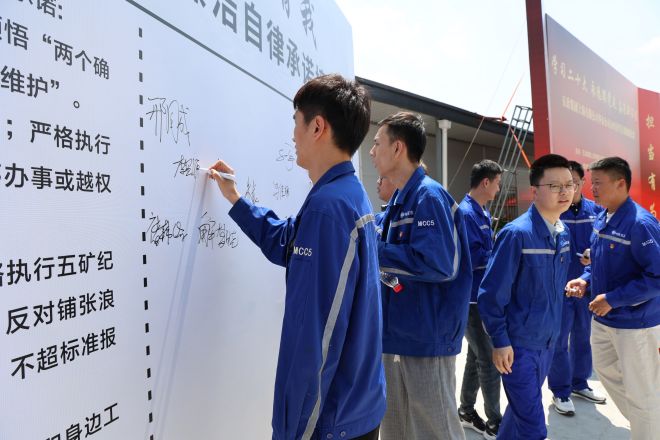 4月26日下午,“學(xué)習(xí)二十大、永遠(yuǎn)跟黨走、奮進(jìn)新征程”五四青年節(jié)主題活動(dòng)在銀湖安置房項(xiàng)目現(xiàn)場(chǎng)拉開序幕。團(tuán)員青年有序進(jìn)場(chǎng),依次在“清廉華東 青廉有我”廉潔自律承諾墻上簽名,并鄭重作出承諾。