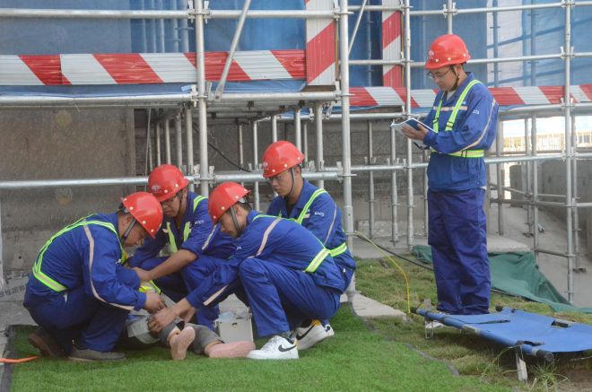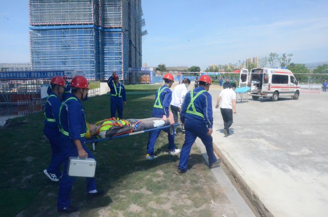 觀摩結(jié)束后,鹽城市大豐區(qū)住建局在項目現(xiàn)場召開住建領(lǐng)域“安全生產(chǎn)月”動員部署會。與會人員在主會場通過視頻直播形式觀看了高處墜落應(yīng)急救援演練。演練模擬10號樓建筑施工人員不慎從高處墜落受傷,現(xiàn)場管理人員了解情況后第一時間上報事故情況。接到事故報告后,項目安全總監(jiān)立即啟動應(yīng)急預(yù)案,撥打120請求救援,并按照醫(yī)護人員指示照護受傷人員,同時立即通知各救援小組趕赴現(xiàn)場按照應(yīng)急預(yù)案停止現(xiàn)場施工作業(yè),封鎖事故現(xiàn)場,注意保護好受傷人員,防止造成二次傷害。隨后,救護車在救援組人員的帶領(lǐng)下來到事故現(xiàn)場,受傷人員被迅速用擔架抬上救護車,最終得到及時救治。