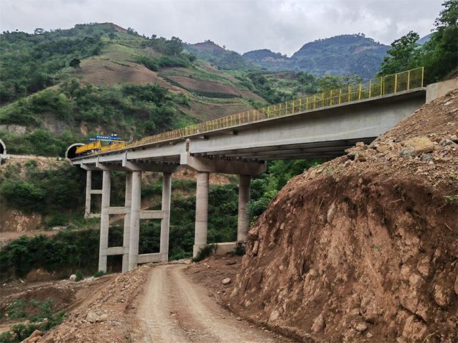 本網訊(通訊員 覃永杰)6月18日,中國十九冶承建的永勐高速公路項目花椒寨特大橋右幅T梁全部架設完成。
