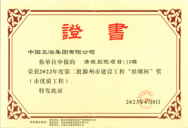 近日,滁州市住房和城鄉(xiāng)建設(shè)局公布2022年度第二批滁州市“瑯琊杯”優(yōu)質(zhì)工程獎(jiǎng)名單,中國(guó)五冶集團(tuán)承建的清瑯別院項(xiàng)目榮膺在列,光榮上榜。