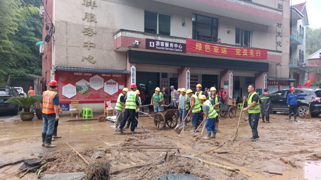 23日早上7點,項目部又集結動員61名突擊隊員、12輛應急車輛和1臺鏟車再次前往石板嶺隧道清理道路淤泥和碎石。災情面前,剛剛經歷完深夜鏖戰的救災隊員們仍是干勁十足,他們與風雨搏斗,與時間賽跑,經過七個多小時的連續作戰,石板嶺隧道口終于恢復道路暢通,當地群眾的出行安全得到了保障。突擊隊員稍作休整,又再次轉戰富陽區大源鎮勤功村,幫助當地村委會解決因強降雨造成的積水內澇問題,及時消除路面安全隱患。