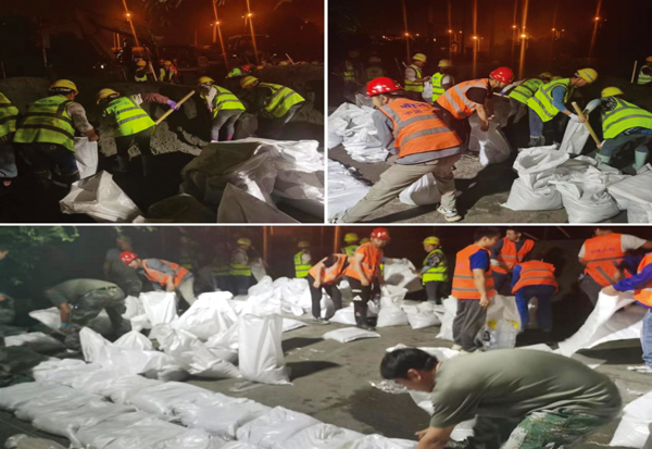 圖為中國(guó)一冶天津公司應(yīng)急搶險(xiǎn)隊(duì)員們?cè)谔旖虮背絽^(qū)抗洪搶險(xiǎn)中。 (中國(guó)一冶天津公司 供圖)