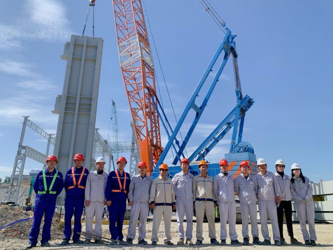 由于項(xiàng)目地處海外,建設(shè)團(tuán)隊(duì)在材料供應(yīng)、人員派遣、大型機(jī)械租賃等諸多環(huán)節(jié)遭遇了重重困難。為確保鋼結(jié)構(gòu)吊裝安全、高效、順利完成,項(xiàng)目部周密策劃、搶先布局,通過(guò)精心組織,順利完成了首批鋼結(jié)構(gòu)的運(yùn)輸工作、大型機(jī)械及輔材供應(yīng)等資源整合工作,為鋼結(jié)構(gòu)首吊創(chuàng)造了有利條件。本次首吊的鋼柱長(zhǎng)22米,重99噸,在現(xiàn)場(chǎng)負(fù)責(zé)人的指令下,掛鉤、起吊、落位一氣呵成,第一根鋼結(jié)構(gòu)被精準(zhǔn)安裝到位,正式拉開(kāi)了該項(xiàng)目高跨鋼結(jié)構(gòu)安裝的序幕。