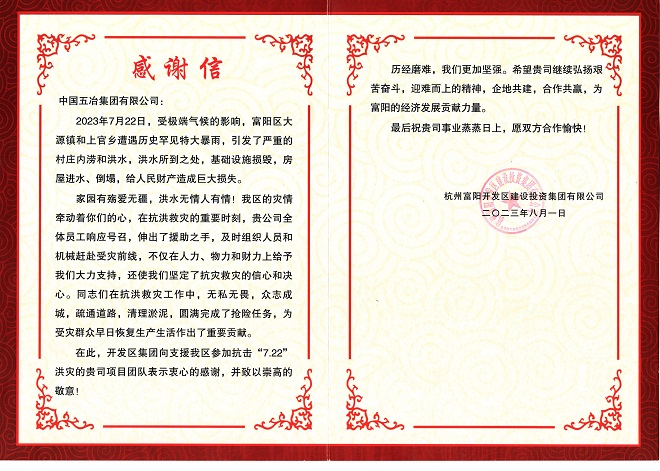 近日,杭州富陽開發區建設投資集團有限公司向中國五冶集團發來感謝信,對中國五冶集團項目團隊在抗擊“7.22”富陽洪災期間的大力支持和無私援助表示衷心感謝并致以崇高敬意。