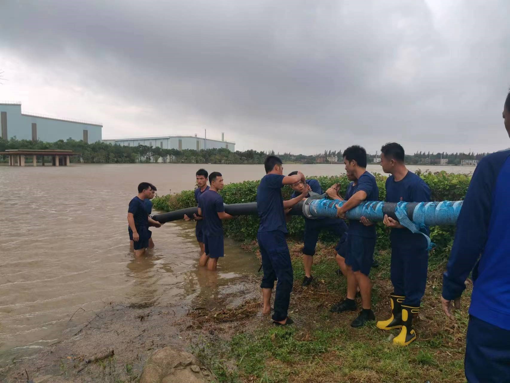 配合排澇,聯勤處置災情。10月19日下午14時,中冶寶鋼接到應急指令稱“銜頭塘泵站水位不斷上升急需快速排水泄洪”。中冶寶鋼迅速組織基層單位11個、人員568人、發電機5臺、大排量抽水泵5臺、消防抽水車2臺,快速投入防汛排澇工作,經過5個小時的艱苦奮戰,順利完成搶險任務。10月19日夜間起,消防應急救援中心積極配合湛江鋼鐵及湛江消防支隊對廠區內多處進行緊急排澇,利用消防車、遠程供水車組等進行排澇作業。針對積水較淺的路段,指戰員帶頭迅速疏通排水管道;針對積水較深區域,利用遠程供水車組快速鋪設水帶進行緊急排澇。截止至10月20日夜間20時,排澇任務仍在進行中。
