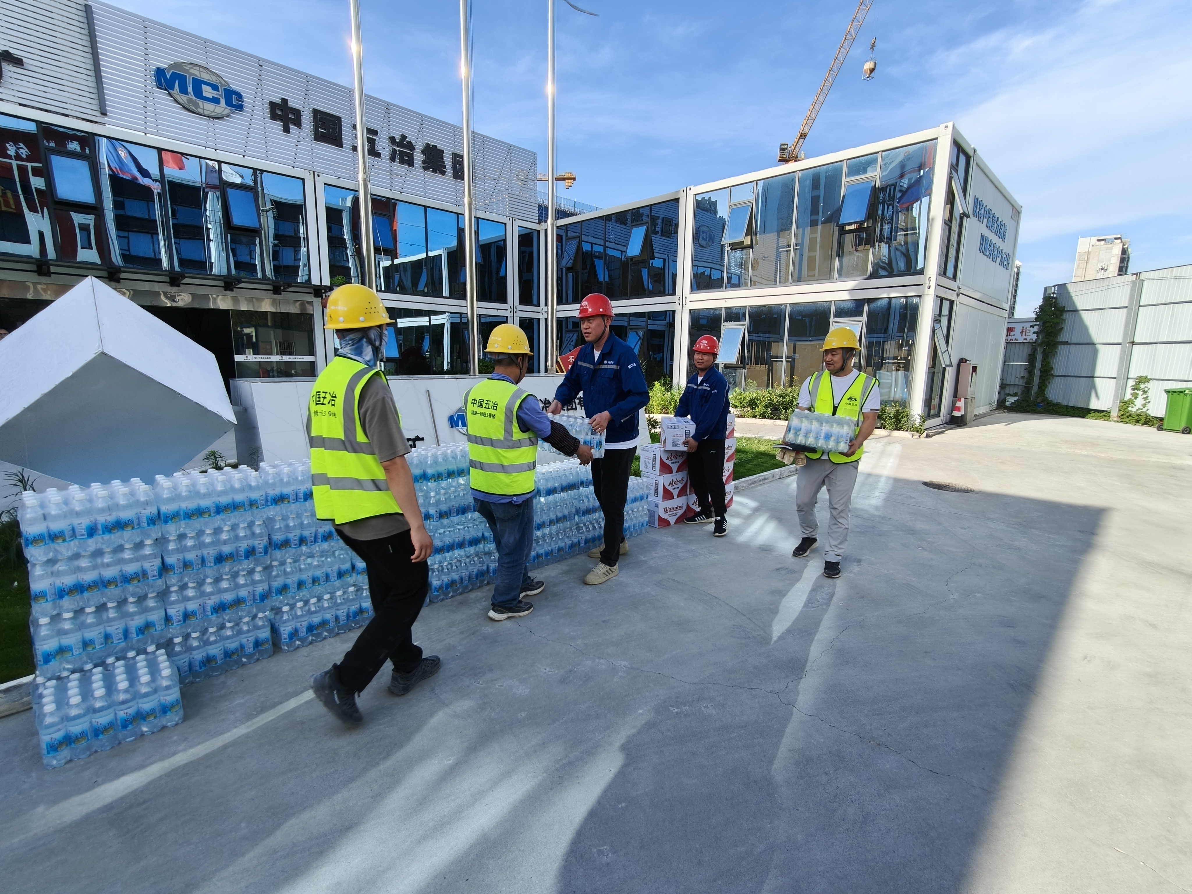 活動開始前,項目安全部門向各參建單位、作業班組宣貫了活動流程、人員分工、注意事項等具體工作。在高處墜落應急演練場景,針對作業人員不慎從高處摔落情況,應急小組迅速反應、立即警戒,醫護人員對傷者進行檢查并采取急救措施,隨后第一時間轉運至醫院救治;在消防疏散應急演練場景,模擬10號樓2層木料發生火情,項目安全員巡視發現后立即報告應急指揮部并拉響火災警鈴,應急指揮部人員使用干粉滅火器開始滅火,樓棟內作業人員在統一指揮下用濕毛巾掩住口鼻有序撤離,應急水車再灑水確保徹底控制火情。隨后,項目部為一線人員送上防暑降溫物品,向他們堅守崗位的辛勤工作表示感謝。
