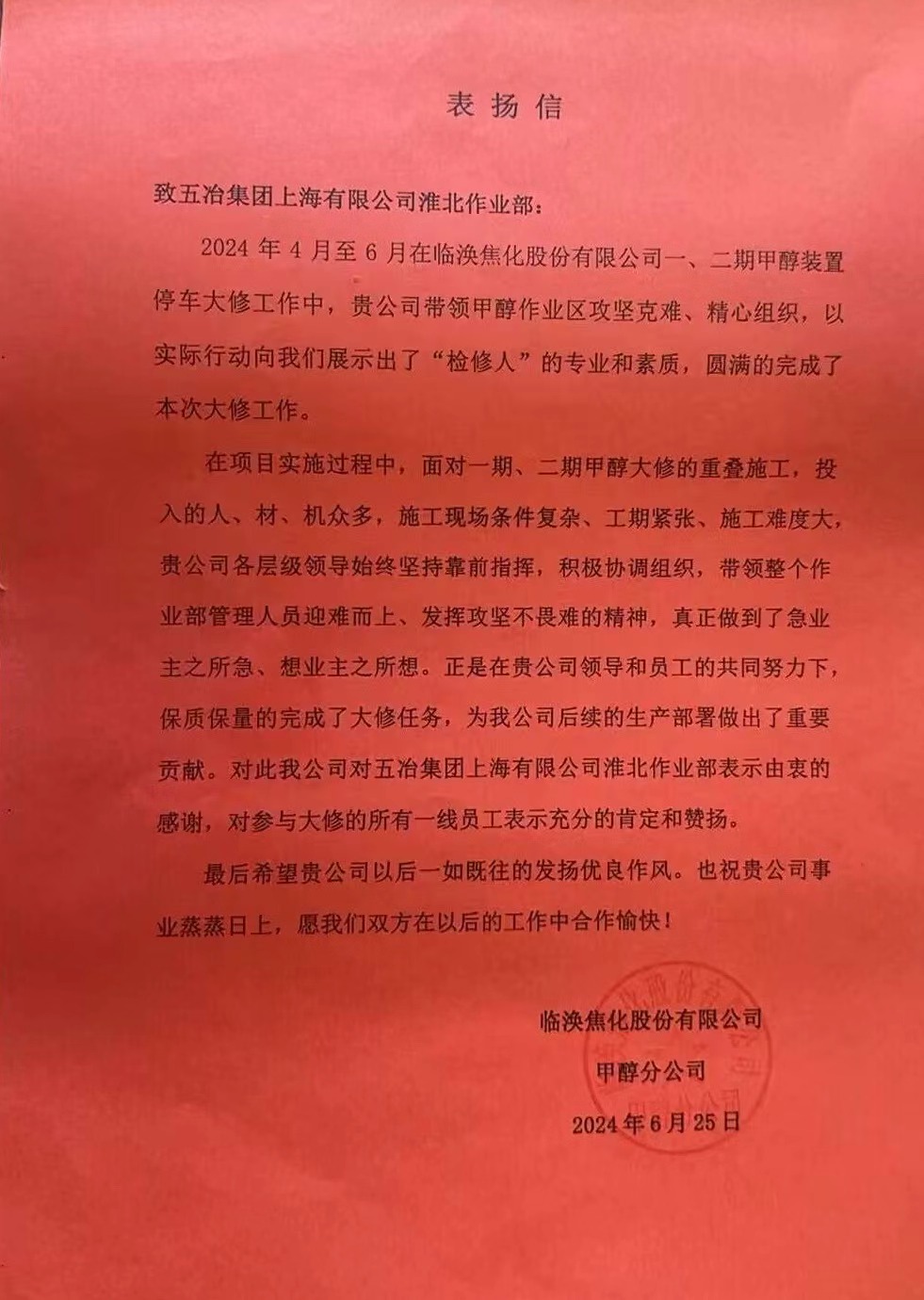 6月26日,五冶集團上海有限公司工程技術服務公司淮北作業部收到臨渙焦化股份有限公司甲醇分公司表揚信與錦旗,表揚淮北作業部在臨渙焦化股份有限公司一、二期甲醇裝置停車大修項目作業過程中精心組織、攻堅克難,安全、優質、高效完成任務。