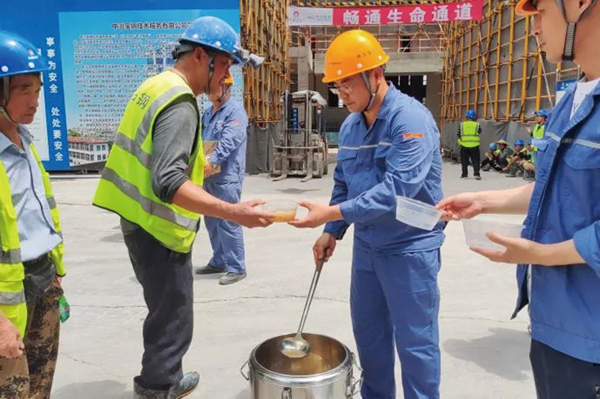 圖為中冶寶鋼置業公司希姆科技項目部領導正為員工盛清冽甘甜的綠豆湯。 (中冶寶鋼 供圖)