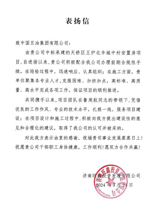 此次收到表揚信,再次表明了業(yè)主方對中國五冶項目團隊的高度認可。接下來,項目團隊將再接再厲,秉持“以服務(wù)客戶為己任、以客戶滿意為宗旨”的理念,不斷樹立良好企業(yè)品牌形象,圓滿完成后續(xù)工程,實現(xiàn)完美履約。