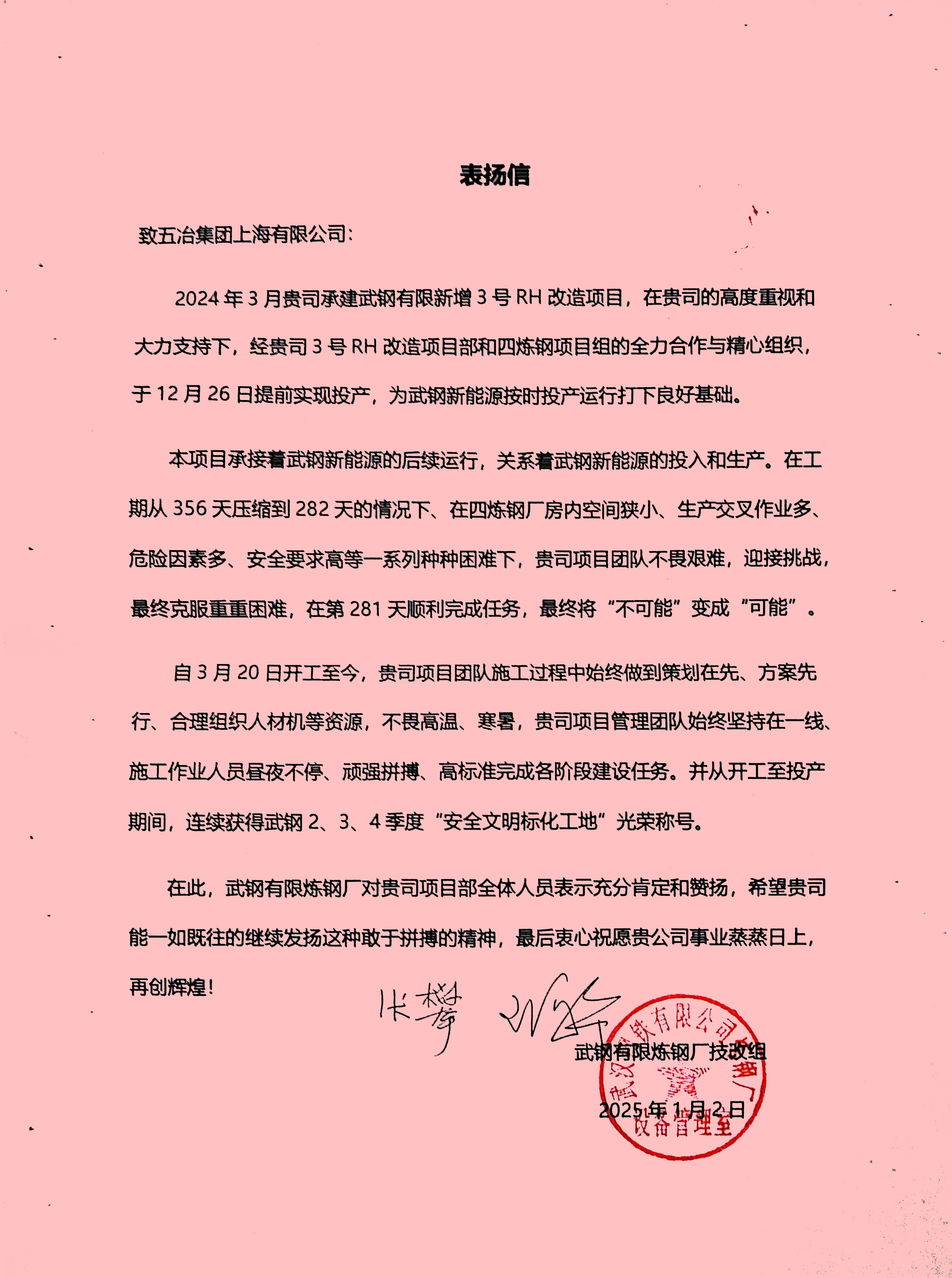 近日,中國五冶集團(tuán)工程技術(shù)服務(wù)公司武鋼四煉鋼項(xiàng)目部收到武鋼有限公司表揚(yáng)信一封,表揚(yáng)武鋼四煉鋼項(xiàng)目部在四煉鋼新增3號RH改造項(xiàng)目施工過程中精心組織、頑強(qiáng)拼搏,順利實(shí)現(xiàn)提前投產(chǎn),為武鋼新能源按時(shí)投產(chǎn)運(yùn)行打下良好基礎(chǔ)。
